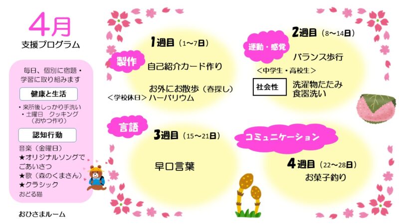 小学1年生から高校3年生までの受給者証をお持ちの子どもさんに、身辺自立や集団生活、個別学習など、子ども1人ひとりにあわせた支援を行っています。 ★利用対象者受給者証をお持ちの小学1年~高校3年生まで (受給者証をお持ちでない方はご相談ください) ★利用地域日進市および近郊市町村にお住まいの方 ★開所日平日 14時~18時 土曜/祝日/長期休暇 10時~17時 ★利用料金1回につき 自己負担 平日 716円 土曜/祝日/長期休暇 773円 ※おやつ代、学習プリント教材費などの実費負担があります ★連絡先電話 0561-72-8779 FAX 0561-76-8862 支援プログラムを公表しました おひさまルーム支援プログラム(2025年1月) 「自分らしく生きていく力」を育てるために 自立に向けて「ひとりで出来る」ことをふやそう 身辺の自立をめざして、ひとつひとつ根気よく身に付けていきます。ひとりで出来ることを増やすために、ひとりひとりの目標に沿ったプログラムで買い物、調理、食器洗い、掃除等の経験を積み重ねます。 集団生活「みんなといっしょだと楽しい」をふやそう 友だち同士で遊ぶことで関わり方を学び、友だちと楽しく遊ぶことの喜びを増やしていきます。ゲーム・音楽やグループで学習する経験を増やし、ルールを学び、みんなといっしょだと楽しいという喜びを味わいます。 個別学習「できた!わかった!たのしい!」をふやそう 子どもにとって学習は楽しいもの。ひとりひとりの発達、理解度に合わせた課題を進めることで、集中力を育て、満足感と自信を持たせます。 教具・オリジナルプリントなどを使って、わかった!を増やします。 (聞く・話す・読む・書く…各教科)30分 ハロウィンパーティ 子どもたちが思い思いの仮装をしてファッションショーや「トリック・オア・トリート」 (Trick or Treat~「いたずらかお菓子か」)と声をかけてお菓子をもらいに行きます。 活動プログラム みんなで貼り絵をしたり、水習字、体操など声かけ合ったり、協力したりと、子どもに合ったやり方で楽しく頑張って作品を仕上げています。 保護者様向け事業運営に関する評価表 放課後等デイサービス自己評価 平成29年度の放課後等デイサービスにかかる基準改正により、「放課後等デイサービスガイドライン」の内容に沿った評価項目が規定され、それに基づく評価をおこない、評価及び改善の内容をおおむね1年に1回以上、公表することが義務付けられました。 放課後等デイサービス「おひさまルーム」のサービスの質について、スタッフ自ら評価・点検した自己評価表を公開しました。 下記よりご覧いただけます。 2018年度放課後等デイサービス評価表【保護者アンケート】 2018年度放課後等デイサービス自己評価表(2019年3月29日実施) 2019年度放課後等デイサービス評価表【保護者アンケート】 2019年度放課後等デイサービス自己評価表(2020年3月14日実施) 2020年度放課後等デイサービス評価表【保護者アンケート】 2020年度放課後等デイサービス自己評価表(2021年3月20日実施) 2021年度放課後等デイサービス評価表【保護者アンケート】 2021年度放課後等デイサービス自己評価表(2022年3月8日実施) 2022年度放課後等デイサービス評価表【保護者アンケート】 2022年度放課後等デイサービス自己評価表(2023年3月14日実施) 2023年度放課後等デイサービス評価表【保護者アンケート】 2023年度放課後等デイサービス自己評価表(2023年3月22日実施) 2024年度放課後等デイサービス自己評価総括表 2024年度放課後等デイサービス【保護者等からの事業所評価】 2024年度放課後等デイサービス【事業所における自己評価】 2025年度放課後等デイサービス自己評価総括表 2025年度放課後等デイサービス【保護者等からの事業所評価】 2025年度放課後等デイサービス【事業所における自己評価】