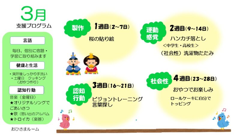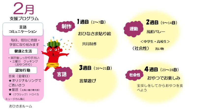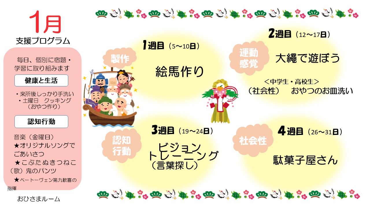 小学1年生から高校3年生までの受給者証をお持ちの子どもさんに、身辺自立や集団生活、個別学習など、子ども1人ひとりにあわせた支援を行っています。 ★利用対象者受給者証をお持ちの小学1年~高校3年生まで (受給者証をお持ちでない方はご相談ください) ★利用地域日進市および近郊市町村にお住まいの方 ★開所日平日 14時~18時 土曜/祝日/長期休暇 10時~17時 ★利用料金1回につき 自己負担 平日 716円 土曜/祝日/長期休暇 773円 ※おやつ代、学習プリント教材費などの実費負担があります ★連絡先電話 0561-72-8779 FAX 0561-76-8862 支援プログラムを公表しました おひさまルーム支援プログラム(2025年1月) 「自分らしく生きていく力」を育てるために 自立に向けて「ひとりで出来る」ことをふやそう 身辺の自立をめざして、ひとつひとつ根気よく身に付けていきます。ひとりで出来ることを増やすために、ひとりひとりの目標に沿ったプログラムで買い物、調理、食器洗い、掃除等の経験を積み重ねます。 集団生活「みんなといっしょだと楽しい」をふやそう 友だち同士で遊ぶことで関わり方を学び、友だちと楽しく遊ぶことの喜びを増やしていきます。ゲーム・音楽やグループで学習する経験を増やし、ルールを学び、みんなといっしょだと楽しいという喜びを味わいます。 個別学習「できた!わかった!たのしい!」をふやそう 子どもにとって学習は楽しいもの。ひとりひとりの発達、理解度に合わせた課題を進めることで、集中力を育て、満足感と自信を持たせます。 教具・オリジナルプリントなどを使って、わかった!を増やします。 (聞く・話す・読む・書く…各教科)30分 ハロウィンパーティ 子どもたちが思い思いの仮装をしてファッションショーや「トリック・オア・トリート」 (Trick or Treat~「いたずらかお菓子か」)と声をかけてお菓子をもらいに行きます。 活動プログラム みんなで貼り絵をしたり、水習字、体操など声かけ合ったり、協力したりと、子どもに合ったやり方で楽しく頑張って作品を仕上げています。 保護者様向け事業運営に関する評価表 放課後等デイサービス自己評価 平成29年度の放課後等デイサービスにかかる基準改正により、「放課後等デイサービスガイドライン」の内容に沿った評価項目が規定され、それに基づく評価をおこない、評価及び改善の内容をおおむね1年に1回以上、公表することが義務付けられました。 放課後等デイサービス「おひさまルーム」のサービスの質について、スタッフ自ら評価・点検した自己評価表を公開しました。 下記よりご覧いただけます。 2018年度放課後等デイサービス評価表【保護者アンケート】 2018年度放課後等デイサービス自己評価表(2019年3月29日実施) 2019年度放課後等デイサービス評価表【保護者アンケート】 2019年度放課後等デイサービス自己評価表(2020年3月14日実施) 2020年度放課後等デイサービス評価表【保護者アンケート】 2020年度放課後等デイサービス自己評価表(2021年3月20日実施) 2021年度放課後等デイサービス評価表【保護者アンケート】 2021年度放課後等デイサービス自己評価表(2022年3月8日実施) 2022年度放課後等デイサービス評価表【保護者アンケート】 2022年度放課後等デイサービス自己評価表(2023年3月14日実施) 2023年度放課後等デイサービス評価表【保護者アンケート】 2023年度放課後等デイサービス自己評価表(2023年3月22日実施) 2024年度放課後等デイサービス自己評価総括表 2024年度放課後等デイサービス【保護者等からの事業所評価】 2024年度放課後等デイサービス【事業所における自己評価】